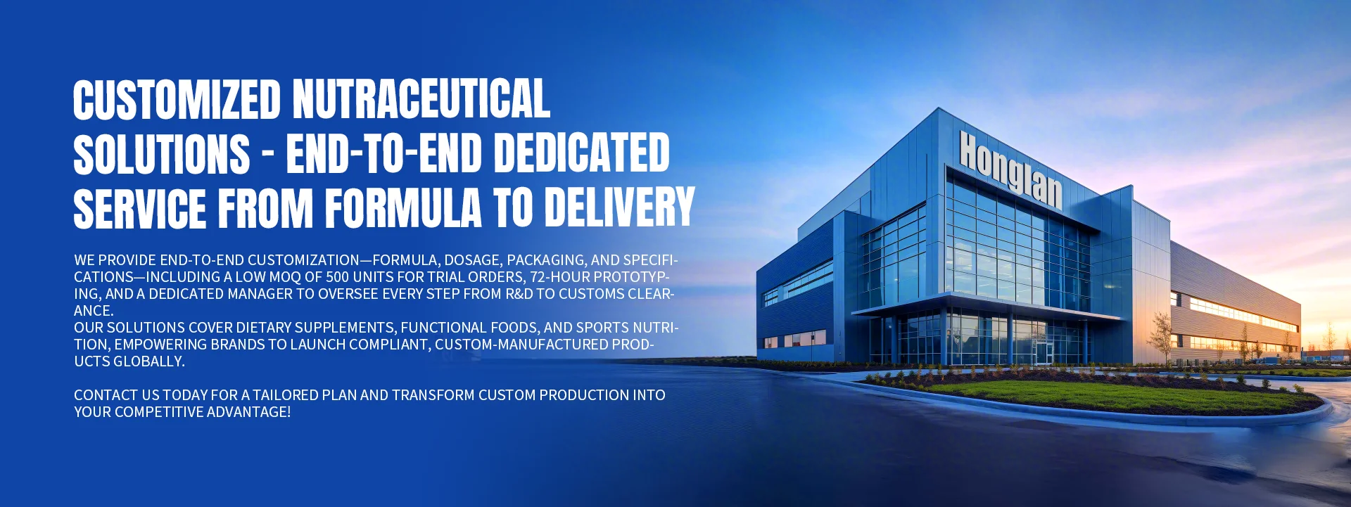 Honglan (Guangzhou) Biotechnology Co., Ltd.is oneof the leading contract manufacturers ofhealth nutrition and dietary supplementsThe production range covers variousdosage forms such as vitamin gummycandies, soft capsules, tablets, and drops
